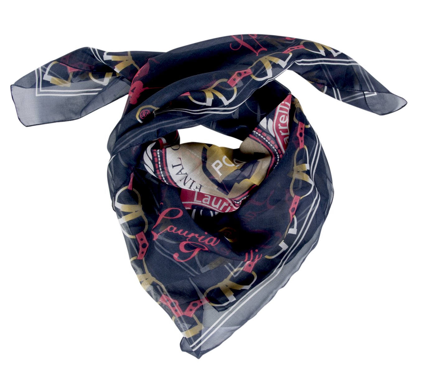 Elegancka chusta -Santa Rosa- Lauria Garrelli. Delikatny materiał, wzór z elementami jeździeckimi. Doskonały pomysł na prezent.