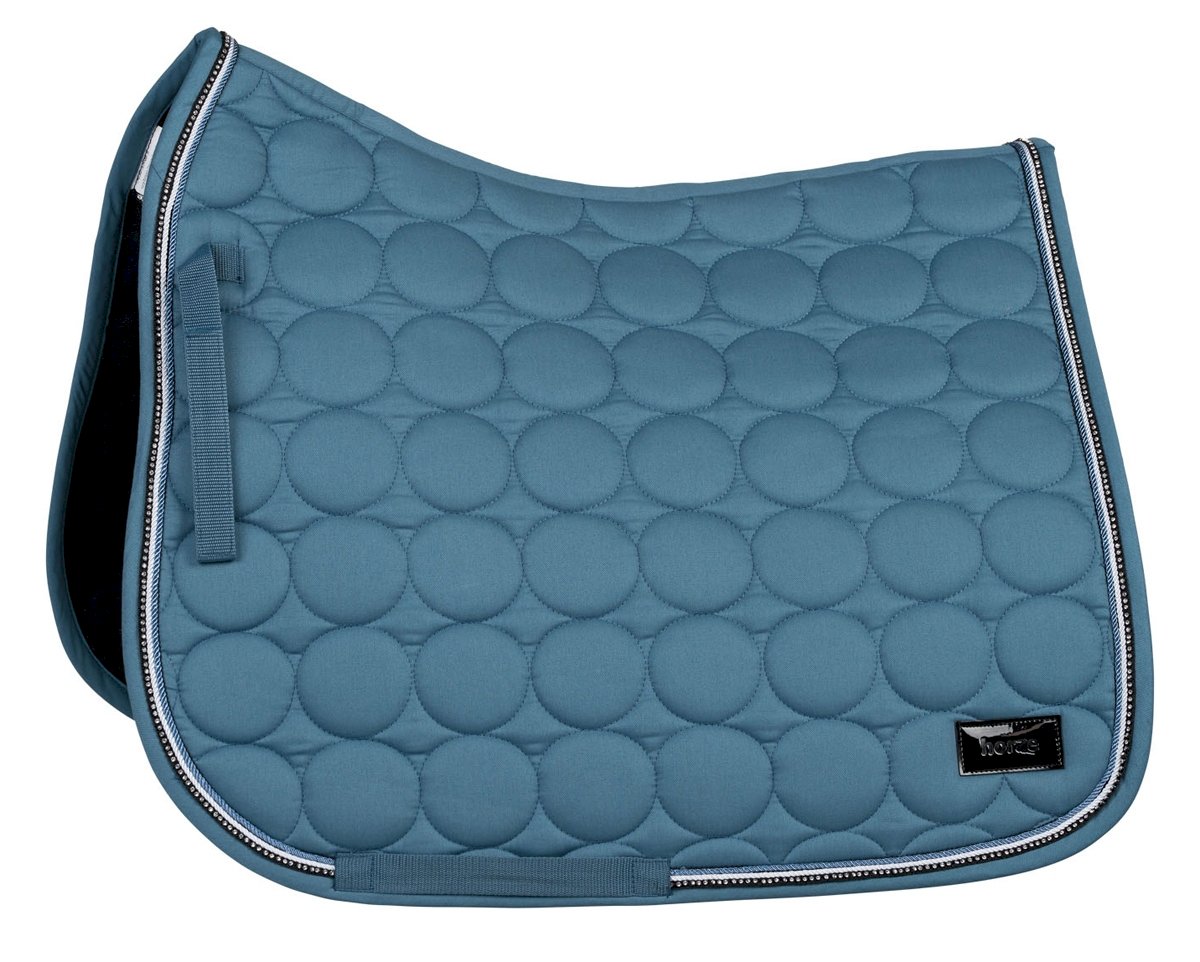 Elegancki czaprak z oryginalnym wykończeniem, wyposażony w szybkoschnącą podszewkę i ozdobną lamówkę. Miękkie wypełnienie zapewnia maksymalny komfort podczas użytkowania i doskonale dopasowuje się do grzbietu konia. Stanowi efektywny komplet wraz z nausznikami Marquess.