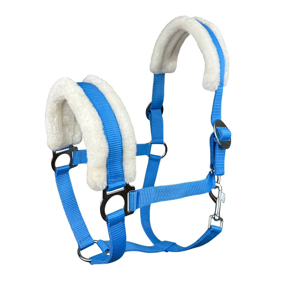 Kantar dla konia podszywany miękkim syntetycnym futerkiem na nachrapniku i potylicy. Posiada mocne okucia ze stali nierdzewnej oraz wytrzymałą taśmę w pastelowych kolorach. Kantar jest regulowany podwójnie na optylicy i zapinany na karabińczyk.