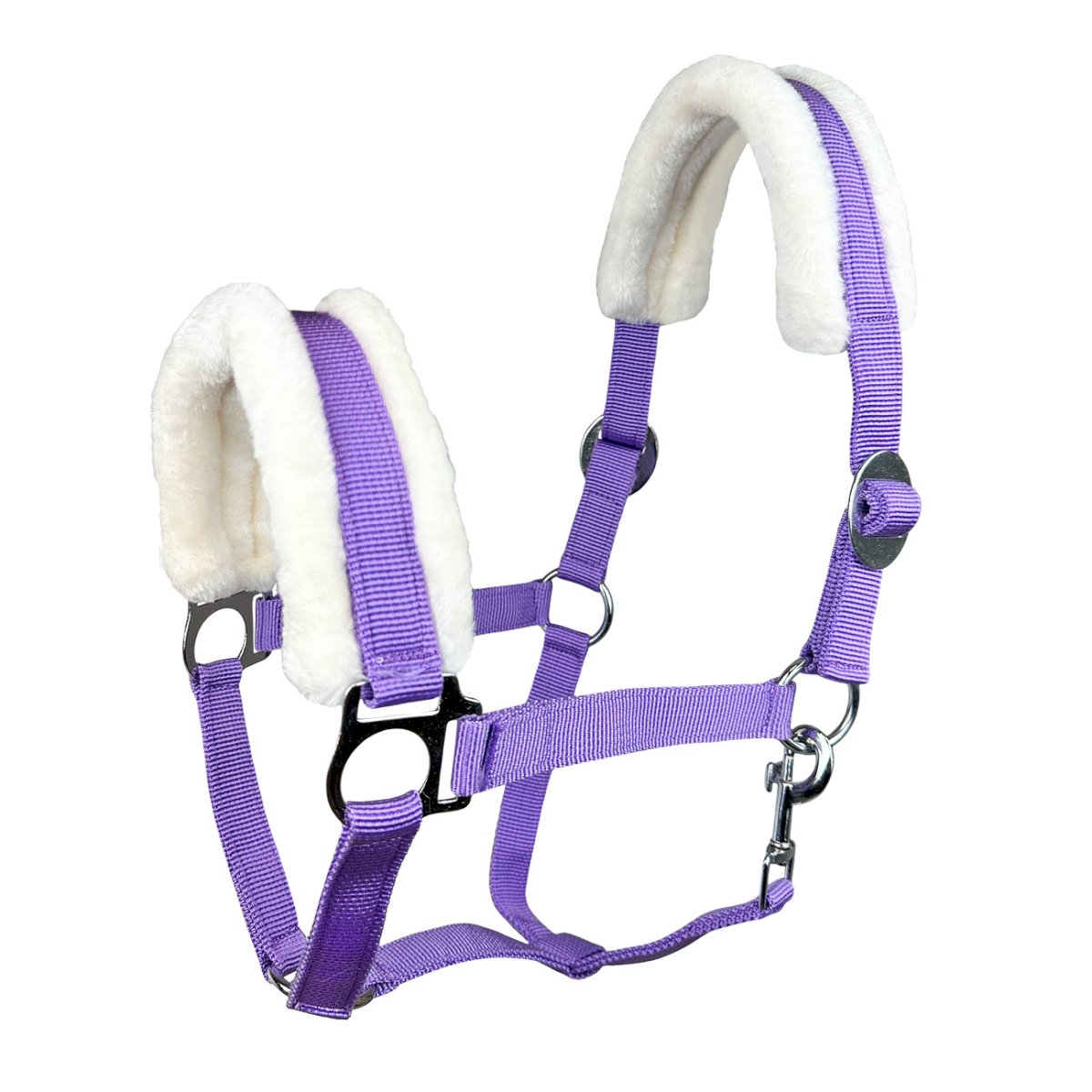 Kantar dla konia podszywany miękkim syntetycnym futerkiem na nachrapniku i potylicy. Posiada mocne okucia ze stali nierdzewnej oraz wytrzymałą taśmę w pastelowych kolorach. Kantar jest regulowany podwójnie na optylicy i zapinany na karabińczyk.