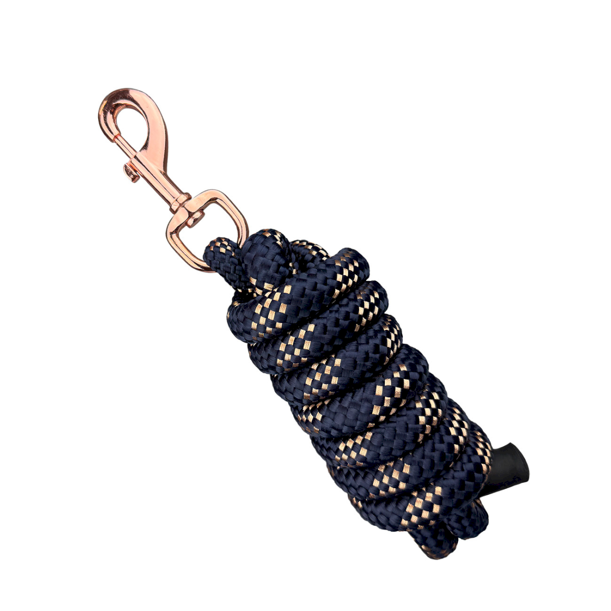 Uwiąz do prowadzenia i wiązania koni. Wykonany z miękkiego, plecionego materiału, zapewnia wygodny chwyt. Obrotowy karabińczyk klasyczny w kolorze rosegold.