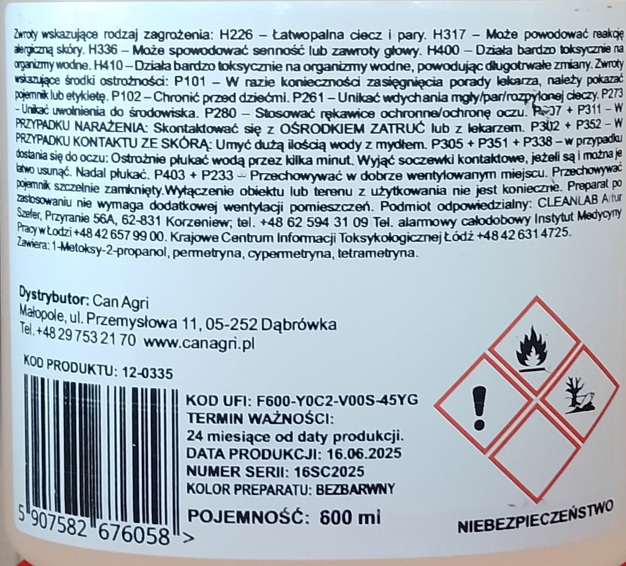 Substancje czynne: permetryna 30g/1kg, cypermetryna 10g/1kg, tetrametryna 3g/1kg
