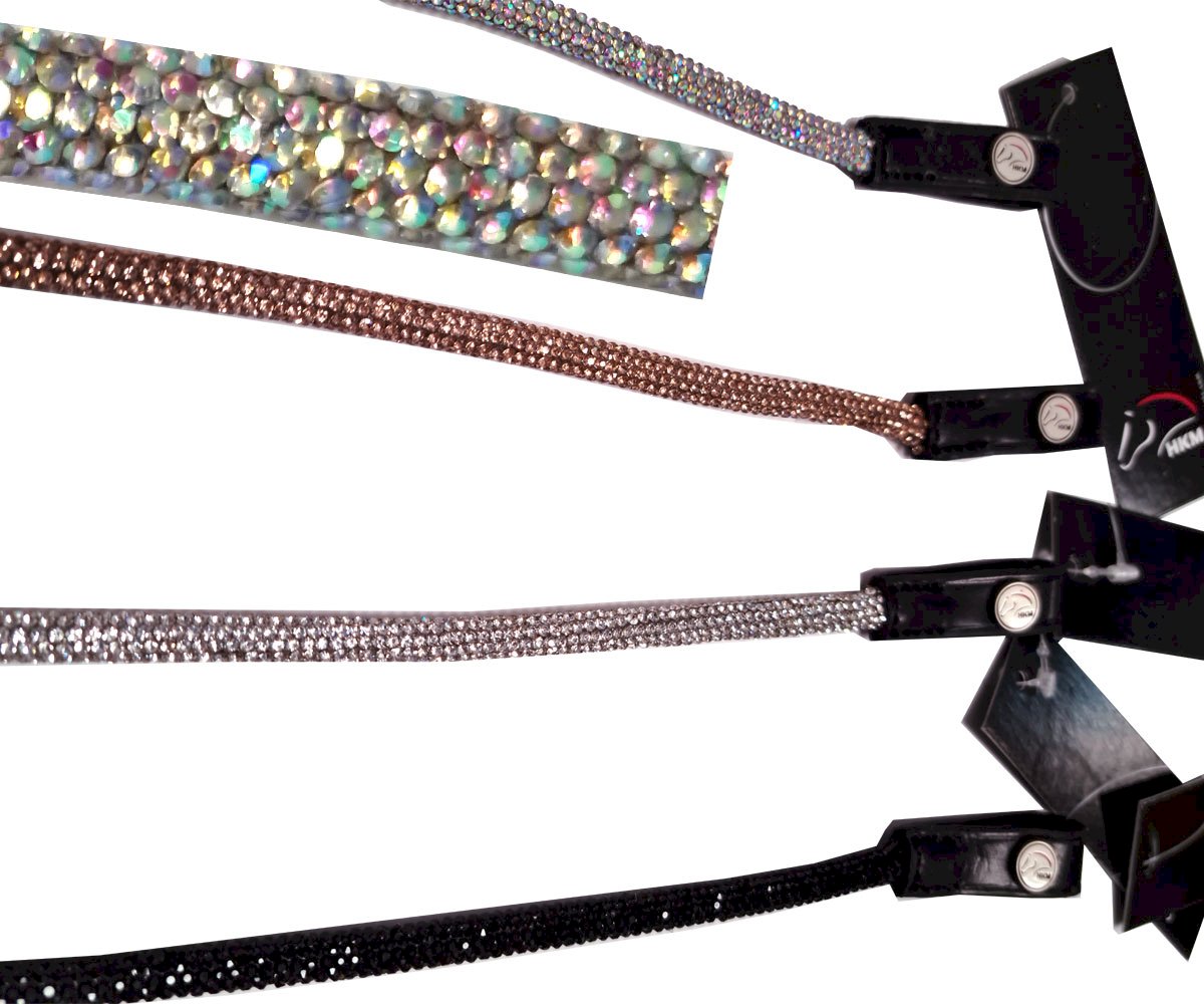 Końcówki naczółka skórzane z logo HKM. Sam naczółek wykonano w formie szytego na okrągło sznura błyszczących kryształków.