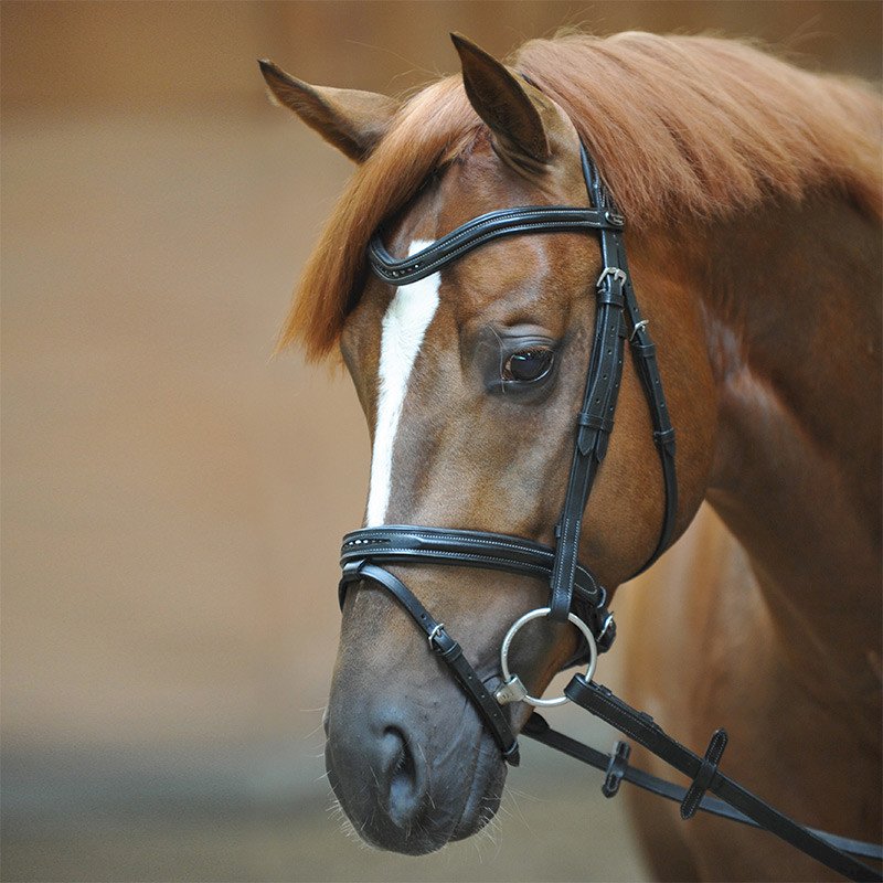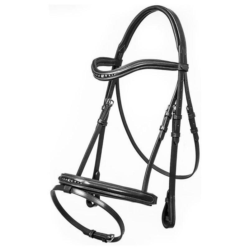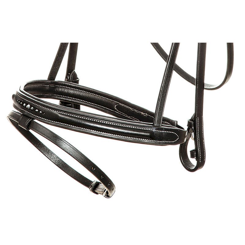 Finezyjne ogłowie Estella ma angielski nachrapnik kombinowany. Nachrapnik i naczółek są ozdobione 9 kryształkami i delikatnie podszyte. Pasek potyliczny w okolicy uszu jest wycięty i miękko wyściełany. Jaśniejsze kontrastowe szwy zapewniają elegancki wygląd.