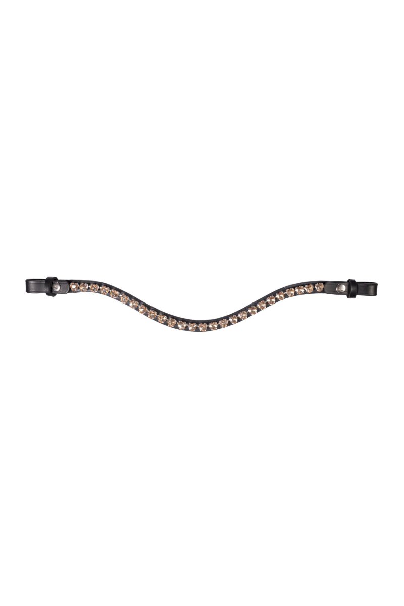 Elegancki naczółek skórzany, który dobrze układa się na czole konia i subtelnie podkreśla wygląd ogłowia. Kształt litery U nadaje mu lekkości, a kryształki w szampańskim kolorze dodają dekoracyjnego akcentu. Zatrzaski ułatwiają szybkie przypięcie i wymianę.