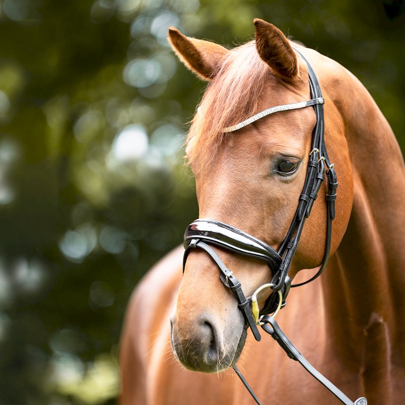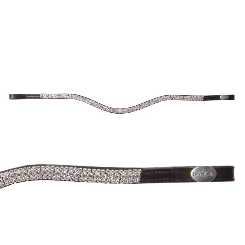 Naczółek Kavalkade Princess dobrze układa się na czole konia dzięki zakrzywionemu kształtowi, który pomaga ograniczyć punktowy nacisk. Potrójny rząd białych kryształków nadaje mu elegancki, wyrazisty wygląd, a marka Kavalkade jest ceniona za wysoką jakość skóry i staranne wykonanie.