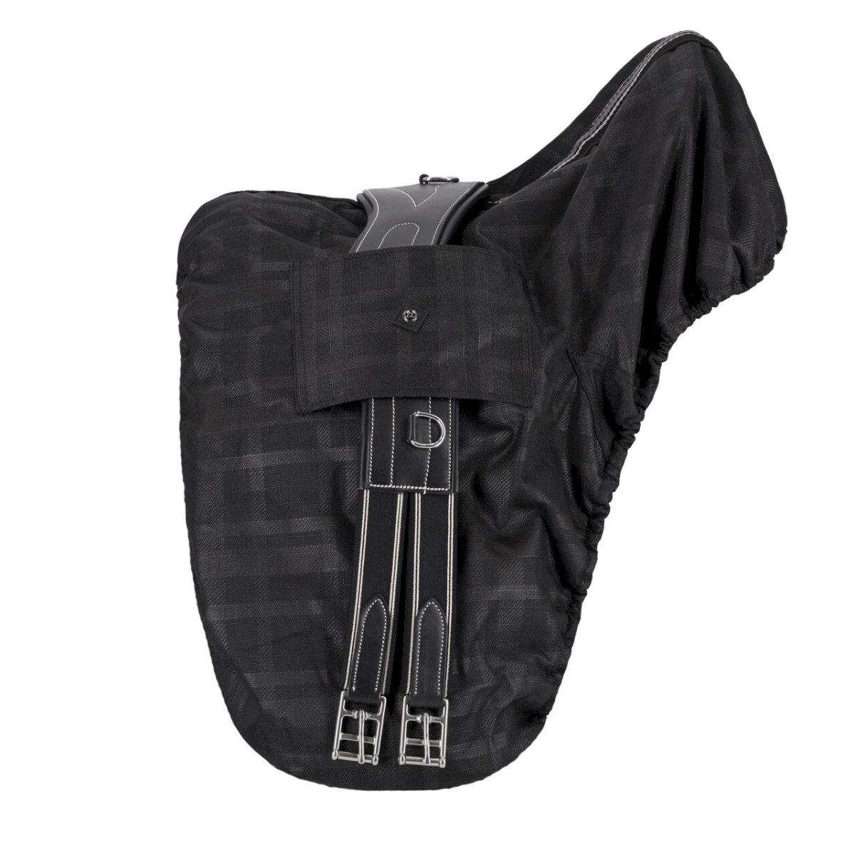 Wodoodporny pokrowiec na siodło wykonany z tkaniny turnout z podszewką z polaru. Pokrowiec pasuje niemal na każde siodło angielskie, rozmiar można wyregulować za pomocą sznurka.