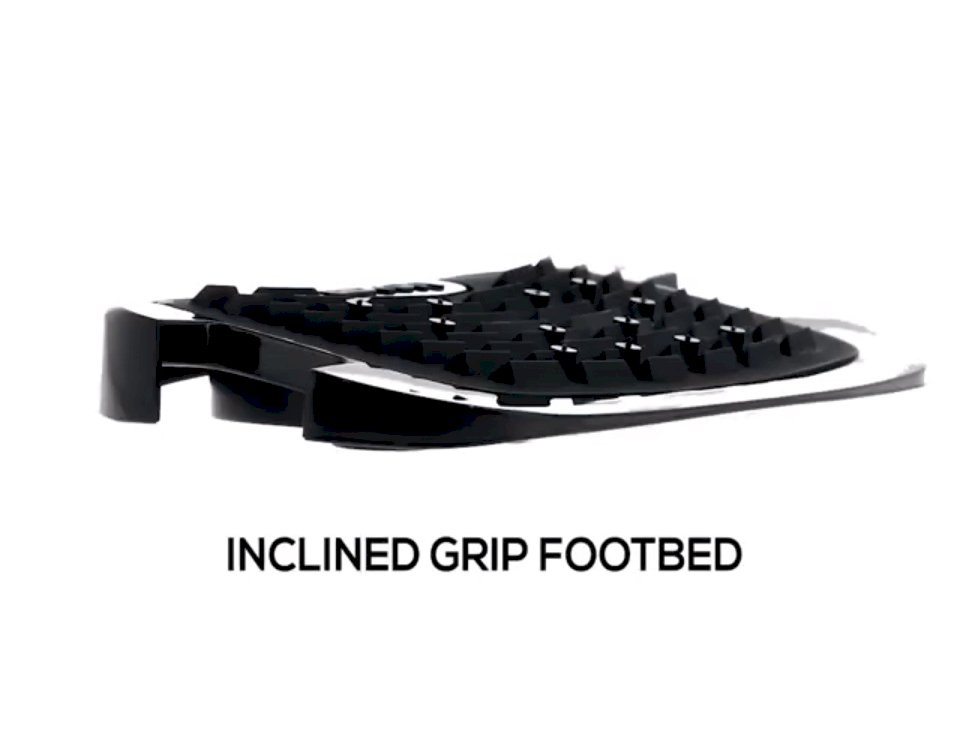 Wkładka/stopka strzemion skośna z wykończeniem antypoślizgowym w wersji Grip. Wersja Grip to odpowiednio uformowana antypoślizgowa wkładka z elastycznego materiału syntetycznego z cieniutkimi, twardymi kolcami dla lepszej przyczepności podeszwy do strzemienia. Kolce nie niszczą sztybletów lub oficerek ponieważ są na tyle niskie, że wchodzą w zagłębienia protektora i nie wbijają się w podeszwy.