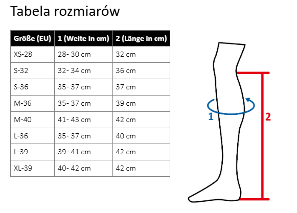 Pierwsza liczba w rozmiarze informuje o wysokości czapsa a druga o obwodzie w najszerszym miejscu łydki. Podane w centymetrach.