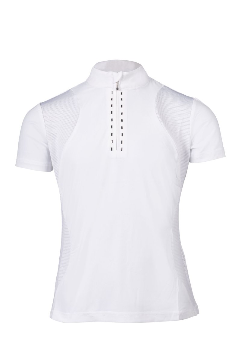 Koszulka konkursowa Glam Kids to wygodny model na zawody jeździeckie dla dzieci. Oddychający i elastyczny materiał dobrze układa się na sylwetce, a siatkowe wstawki po bokach pomagają zwiększyć komfort podczas jazdy. Zamek z przodu ułatwia zakładanie i nadaje całości sportowo-elegancki wygląd.