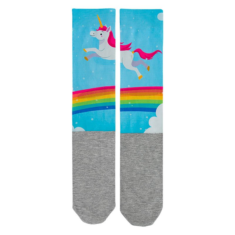 Podkolanówki o tematyce okołokońskiej (jednorożce) Cienkie i elastyczne podkolanówki. Stopa wykonana z bawełny z dodatkiem lycry, łydka z gładkiego i cienkiego materiału poliestrowego.