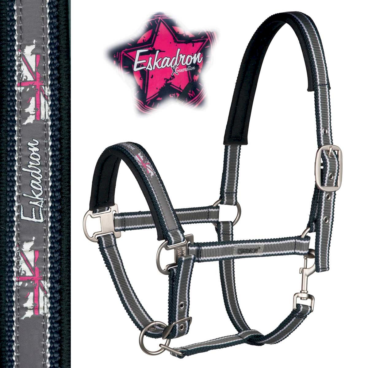 Kantar Eskadron Next Generation - wysokiej jakości kantar z podwójną regulacją i z podszyciem (na potylicy i nachrapniku), zapięcia na sprzączki, ładne okucia z napisem Eskadron, podwójne taśmy 25mm odporne na rozdarcia.