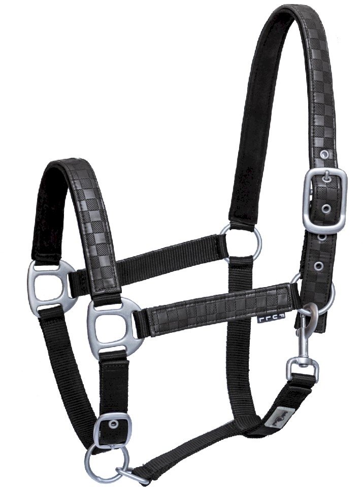 Wyjątkowo elegancki kantar pokryty imitacją skóry tłoczonej w kwadraty. Miękkie podszycie nachrapnika, pasków policzkowych i potylicznego zapobiega obcieraniu się konia. Podwójna regulacja. Okucia o zaokrąglonych kształtach.