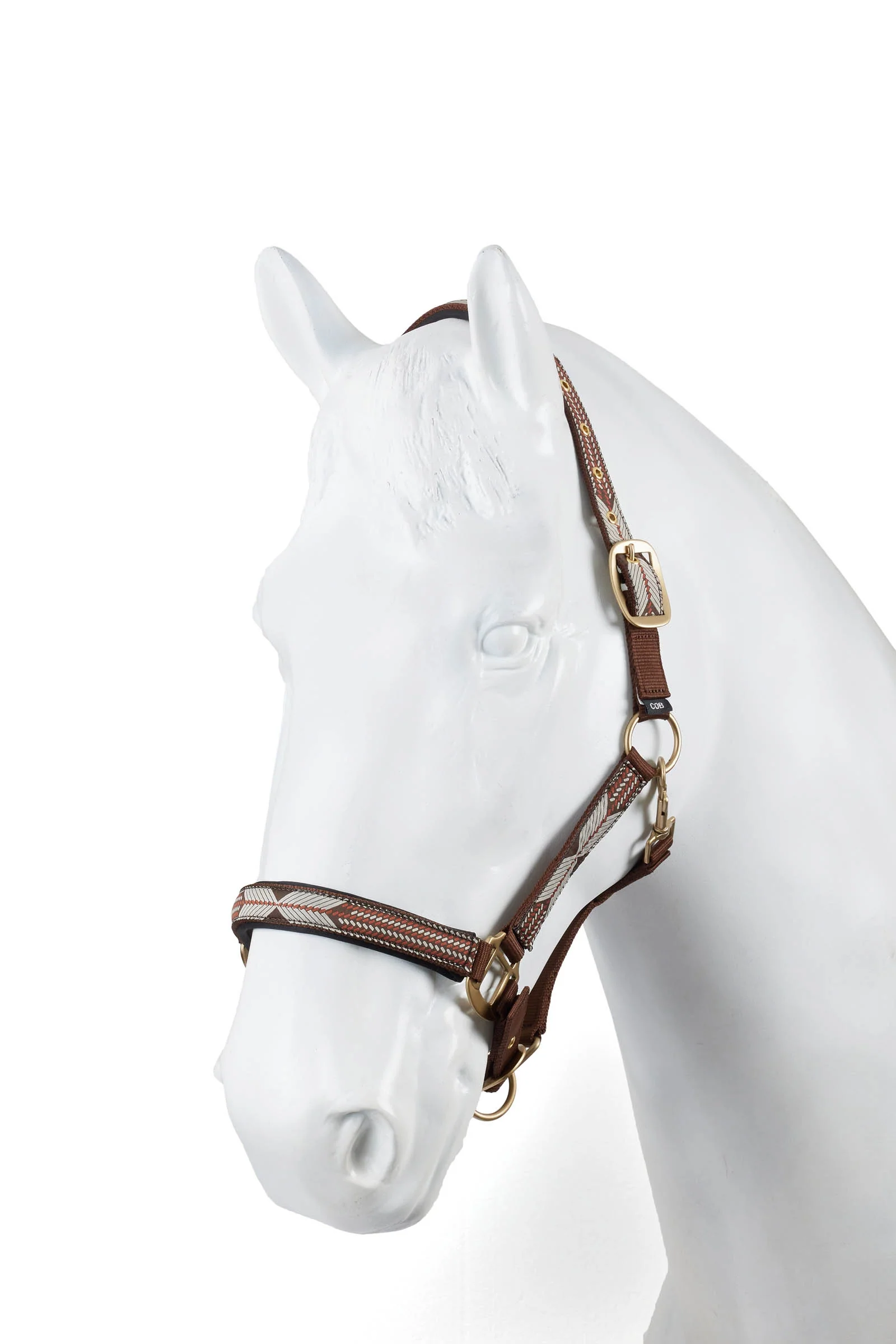 Kantar Dakota z nadrukiem w stylu westernowym wyróżnia się dekoracyjną taśmą żakardową i dopracowanymi detalami w satynowym odcieniu złota. Miękka wyściółka z neoprenu na nachrapniku i potylicy poprawia wygodę noszenia, a regulowany nachrapnik pozwala lepiej dopasować kantar do głowy konia.