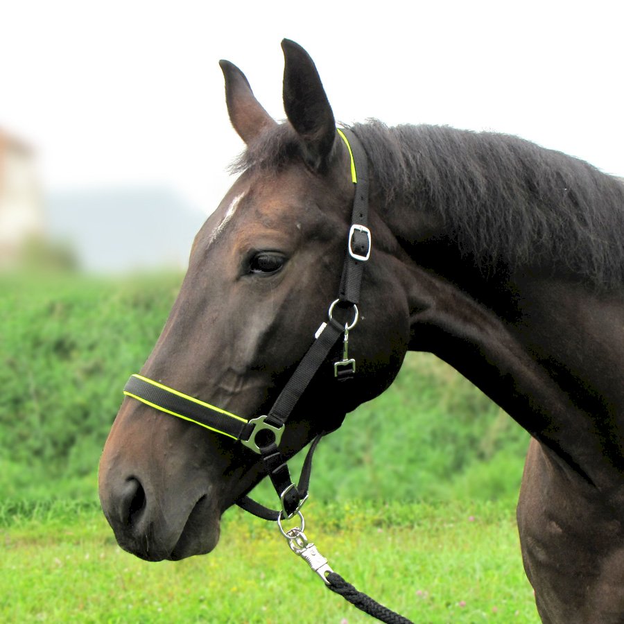 Miękko podszywany kantar z podwójną regulacją, zapinany na karabinek, okucia niklowane na srebrno. Podszycie wykonano z miękkiej pianki polipropylenowej pokrytej kolorowym materiałem, który się nie mechaci.