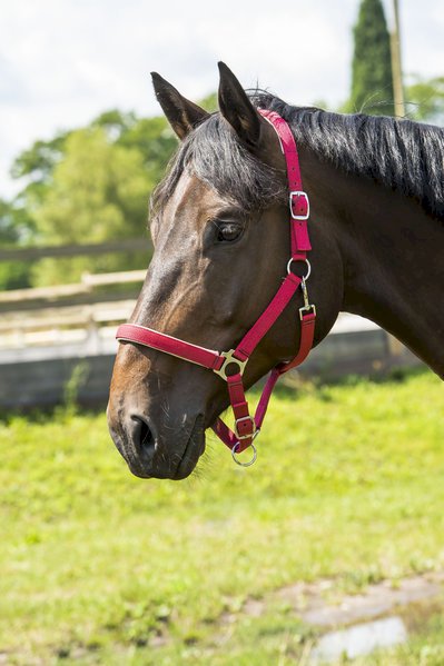 Miękko podszywany kantar z podwójną regulacją, zapinany na karabinek, okucia niklowane na srebrno. Podszycie wykonano z miękkiej pianki polipropylenowej pokrytej kolorowym materiałem, który się nie mechaci.
