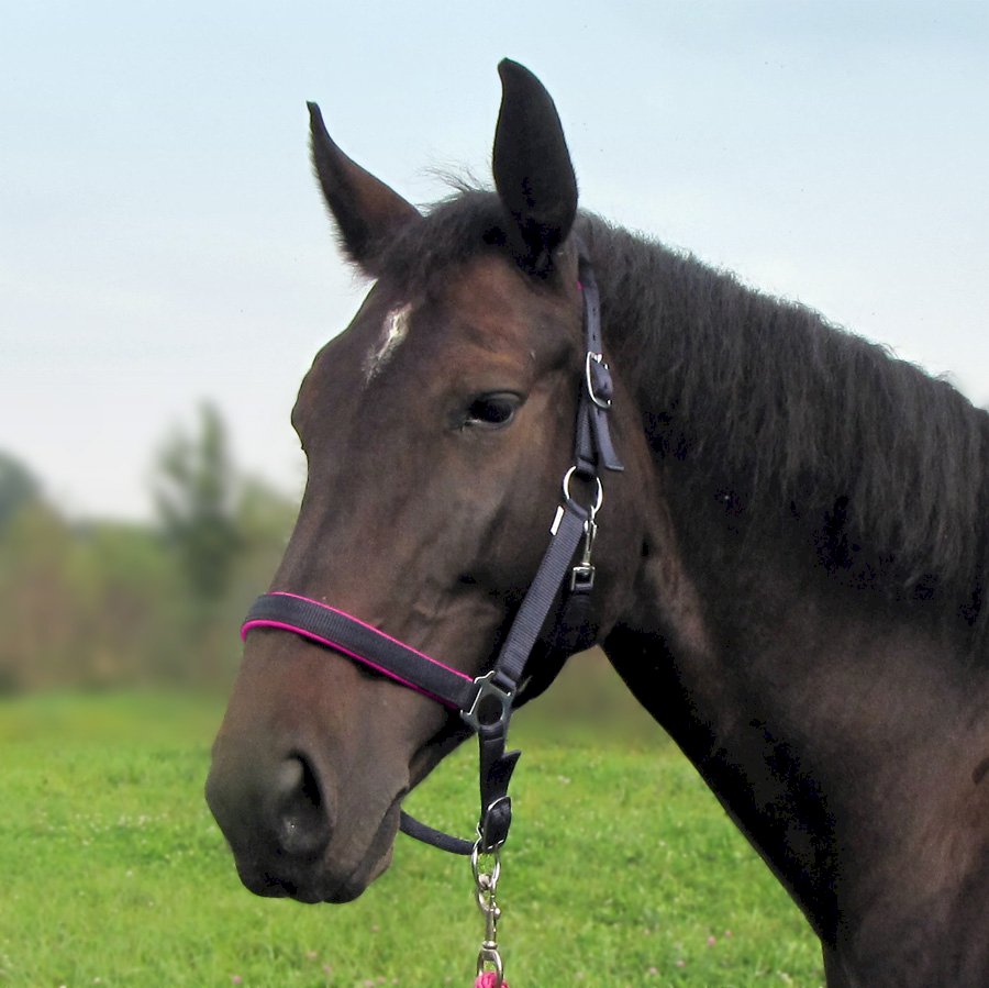 Miękko podszywany kantar z podwójną regulacją, zapinany na karabinek, okucia niklowane na srebrno. Podszycie wykonano z miękkiej pianki polipropylenowej pokrytej kolorowym materiałem, który się nie mechaci.