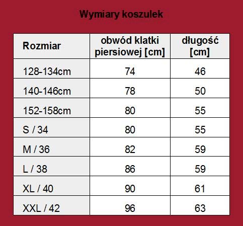 Wymiary koszulek podane są w załączonej tabeli.