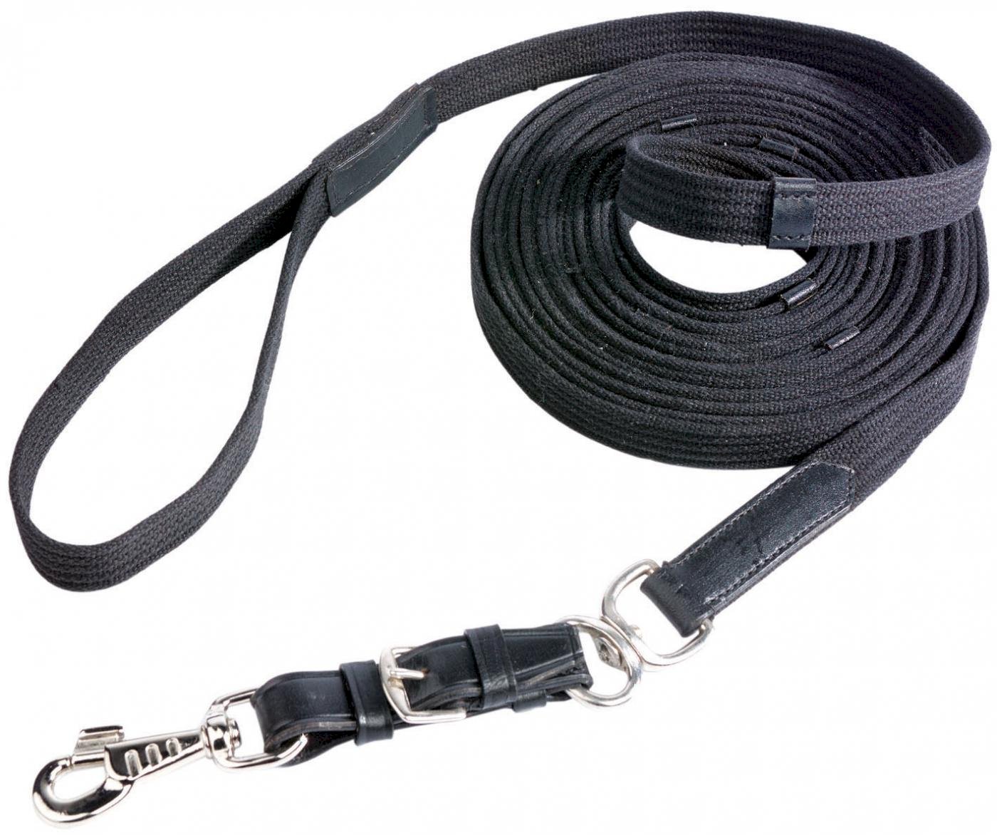 Parciana, bawełniana lonża Diana z naszytymi skórzanymi stoperami, ruchomą obrotową końcówką oraz obrotowym karabińczykiem. Szerokość lonży: 23mm, długość lonży: 8,5m