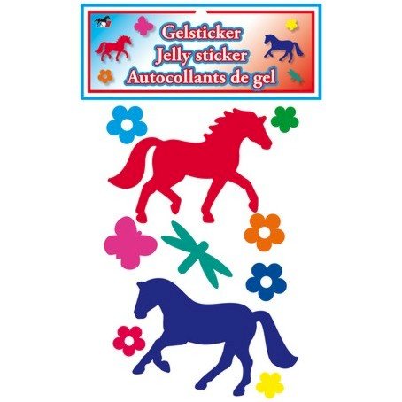 - żelowe naklejki w kształcie koni i kwiatków, które mogą być naklejone na gładką powierzchnię