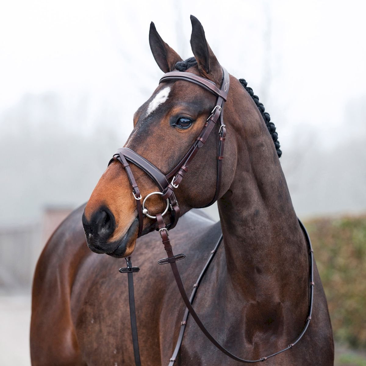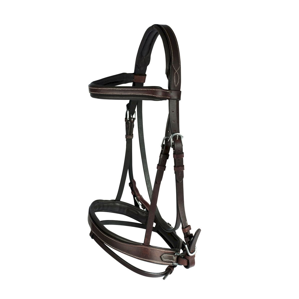 Ogłowie wędzidłowe z nachrapnikiem kombinowanym (irlandzkim) z wysokiej jakości skóry. Szeroki nachrapnik miękko podszyty. W zestawie wodze ze stoperami. Okucia w kolorze srebrnym. Białe szwy na pasku potylicznym, naczółku i nachrapniku.
