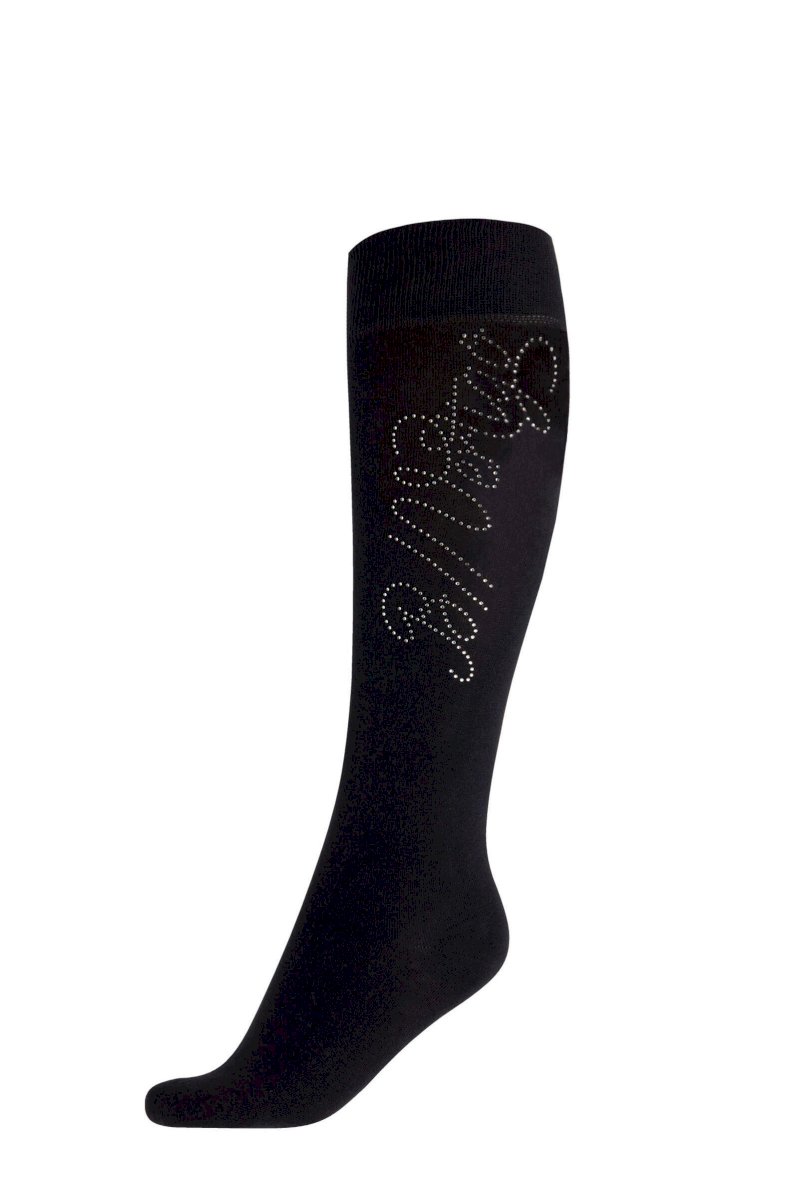 Miękkie podkolanówki jeździeckie z eleganckim napisem B/Vertigo z kryształków.