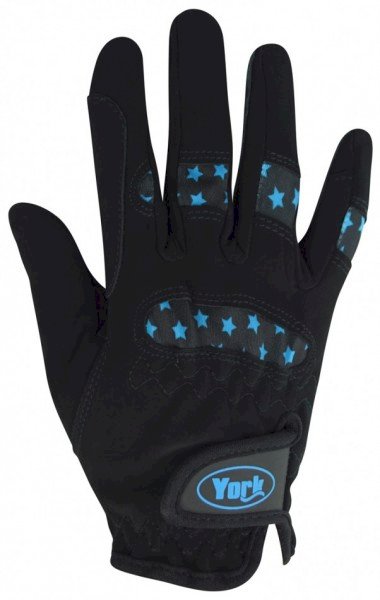 Rękawiczki jeździeckie York Estrella, w kolorze czarno- turkusowym. Wygodny model rękawiczek jeździeckich wykonany z materiału imitującego nubuk. Elastyczne wstawki ozdobione wzorem w gwiazdki poprawiają komfort oraz nadają nietuzinkowego wyglądu. Rękawiczki posiadają wzmocnienia w miejscu trzymania wodzy. Idealne dla młodych jeźdźców.