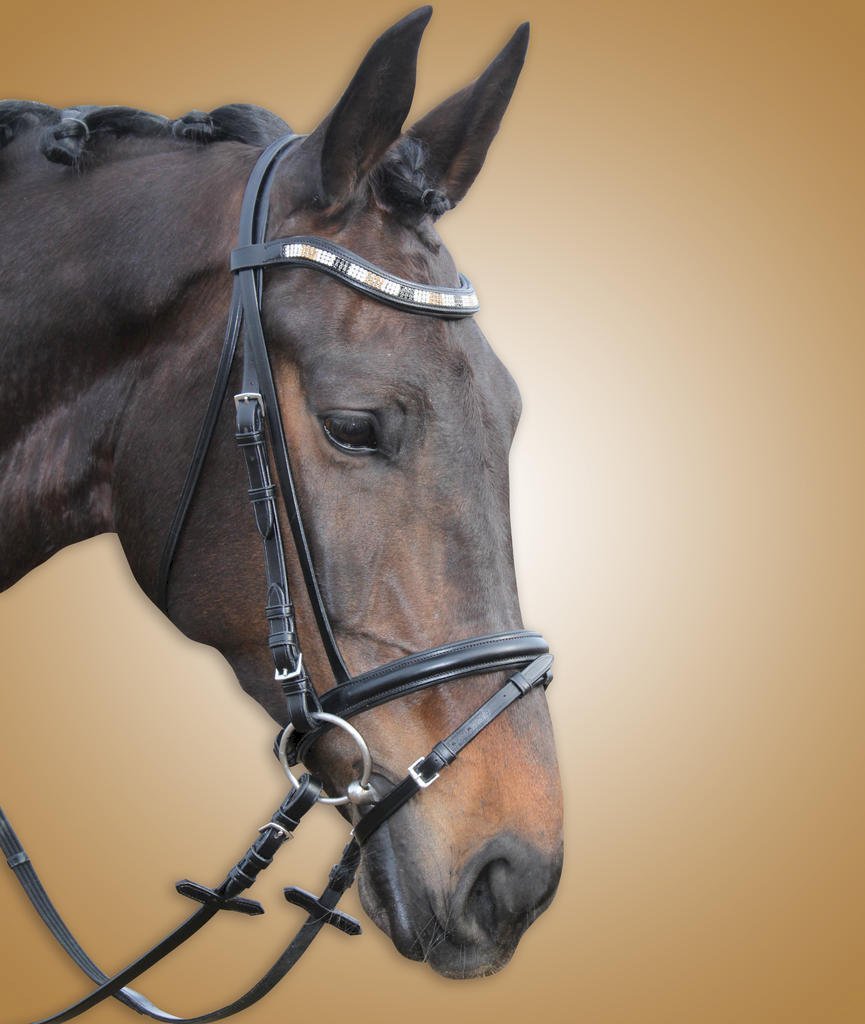 • eleganckie ogłowie z opadającym naczółkiem ozdobionym cyrkoniami w trzech kolorach