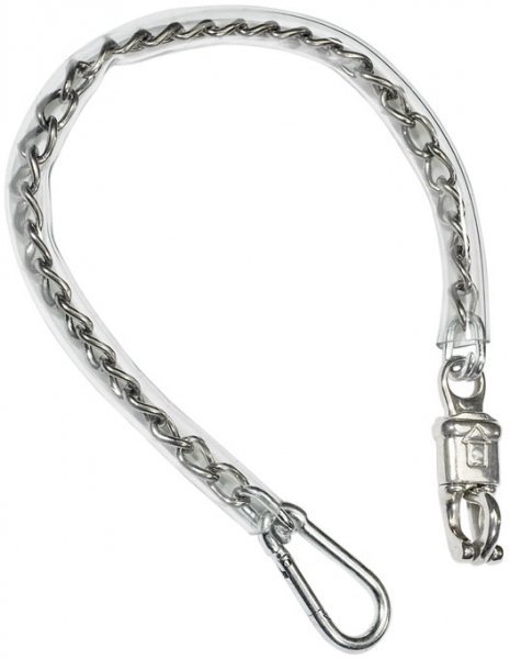 Metalowy łańcuch osłonięty gumą idealny jako uwiąz do przyczepy. Z jednej strony posiada karabińczyk oczkowy, a z drugiej karabińczyk bezpieczeństwa.